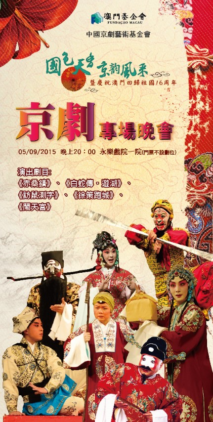 No intuito de promover a cultura chinesa e elevar o nível de apreciação da arte da Ópera de Pequim, e com organização da Fundação Artística de Ópera Chinesa da China e da Fundação Macau, vai-se realizar o “Espectáculo da Ópera de Pequim em Comemoração do 16.º Aniversário do Retorno de Macau à Pátria” no dia 5 de Setembro, pelas 20H00 no Cinema Alegria. Os bilhetes são gratuitos e serão distribuídos ao público nos dias 3 e 4 de Setembro.